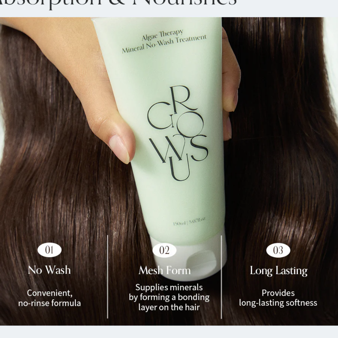 Consigue un acabado brillante, suave y saludable con Growus Algae Therapy Mineral No-Wash Treatment. ¡Un tratamiento marino intensivo en cada gota!